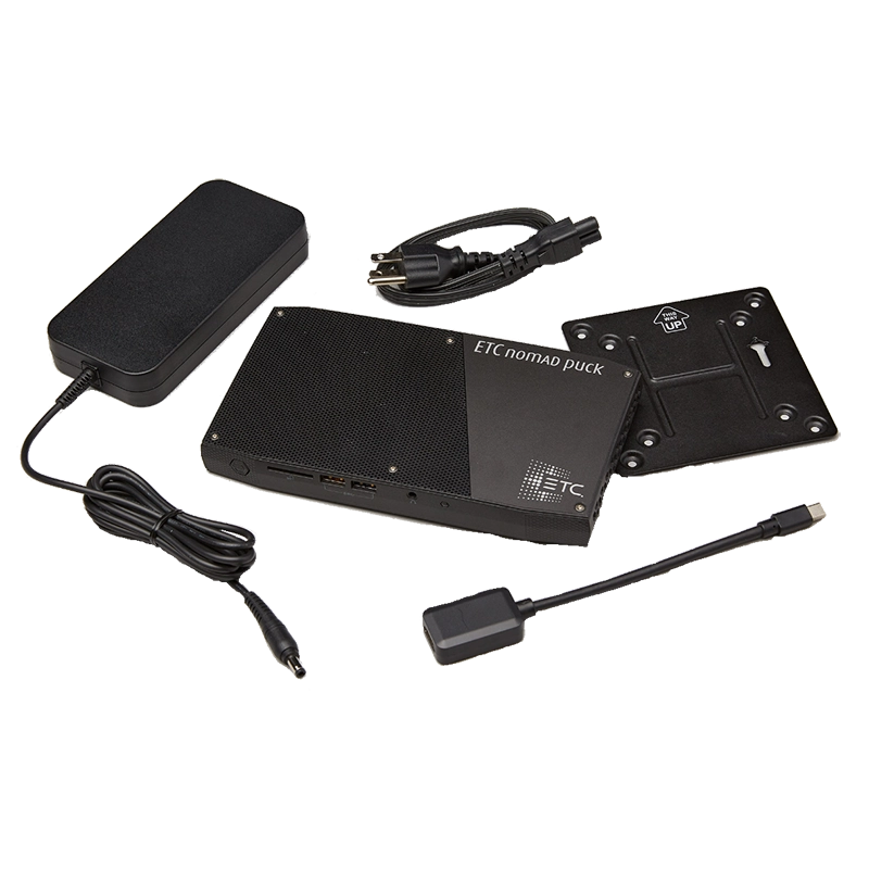 The ETC Puck lighting controller is a full-featured mini-computer with an embedded ETCnomad lighting control key capable of running Eos and Element applications. It provides lighting control with conventional and moving lights, media servers and LED luminaires. The ETC Puck lighting controller can be used in primary, backup, client and offline environments. Optional fader wings, programming wings, X-keys and compatibility with USB–MIDI panels allow extended and customizable control.