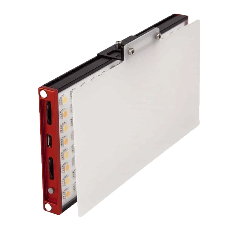 The Aladdin A-Lite is a high-end variable bi-colour on-board LED light with an integrated battery. The light quality of the Aladdin A-Lite is outstanding with CRI and TLCI ratings of over 97 for both tungsten and daylight. The integrated lithium-ion battery has a runtime of 1 hour and 20 minutes at full power and can be charged quickly via the included Micro USB-to-USB cable.