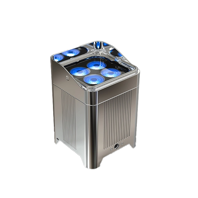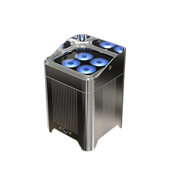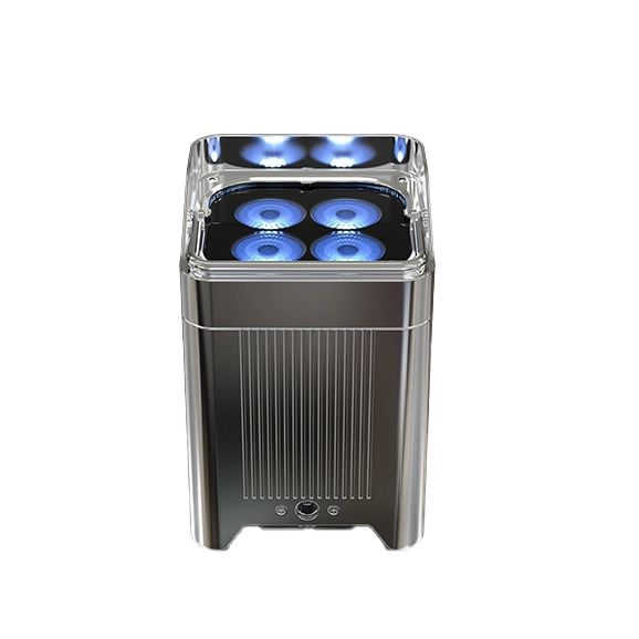 - A completely wireless IP65 rated battery powered up-light with four high powered quad colored RGBA LEDs that is controlled by W-DMX or IR remote.