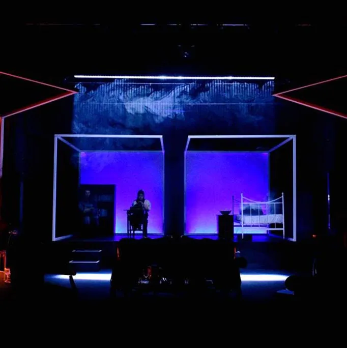 Harvey commented “I’m in my third year at Rose Bruford and this was my last show. I had worked with the GLP bar 20s before and seen them in action and I loved the tight beam you get when using the haze. From the early stages of the show, I knew I wanted to use them for a light curtain effect at the very end of the play. These were all great ideas but I didn’t think we ever get the budget to have them. But thanks to Colin and TSL for supporting me at uni I was able to realise my design. I had four in the air for a light curtain. Then 4 on the floor. Not only did they give me the light curtain haze effect but I also utilised the dual pixel mode and used them for side lighting the faces of the actors.”